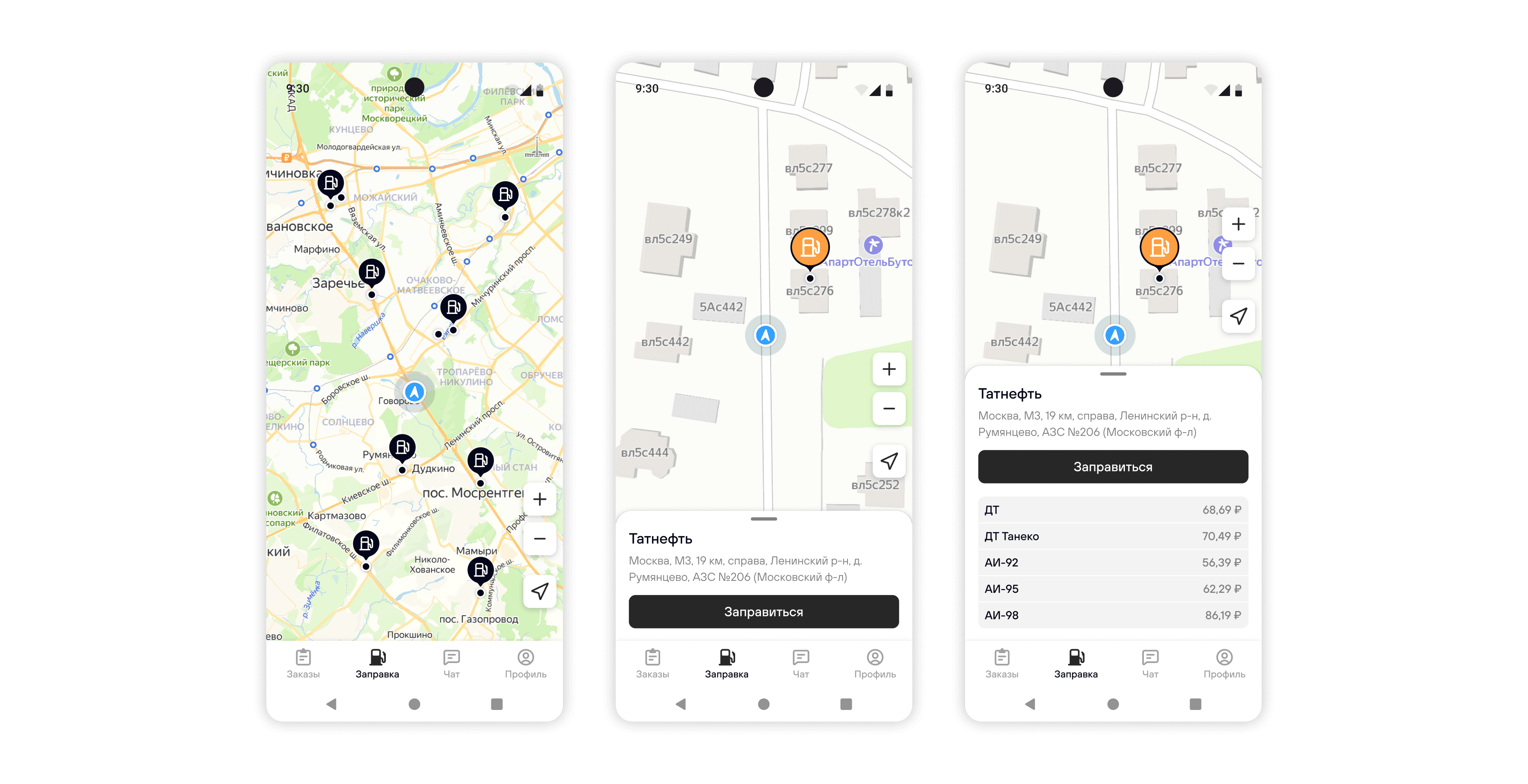 Карта стала основным навигационным слоем: маркеры унифицированы, бренд выделен визуально, мини-карточка станции содержит только ключевую информацию — цены, адрес, доступность и кнопку «Заправиться». Выделение выбранной АЗС и переключение между списком и картой помогли снизить ошибки и повысить наглядность