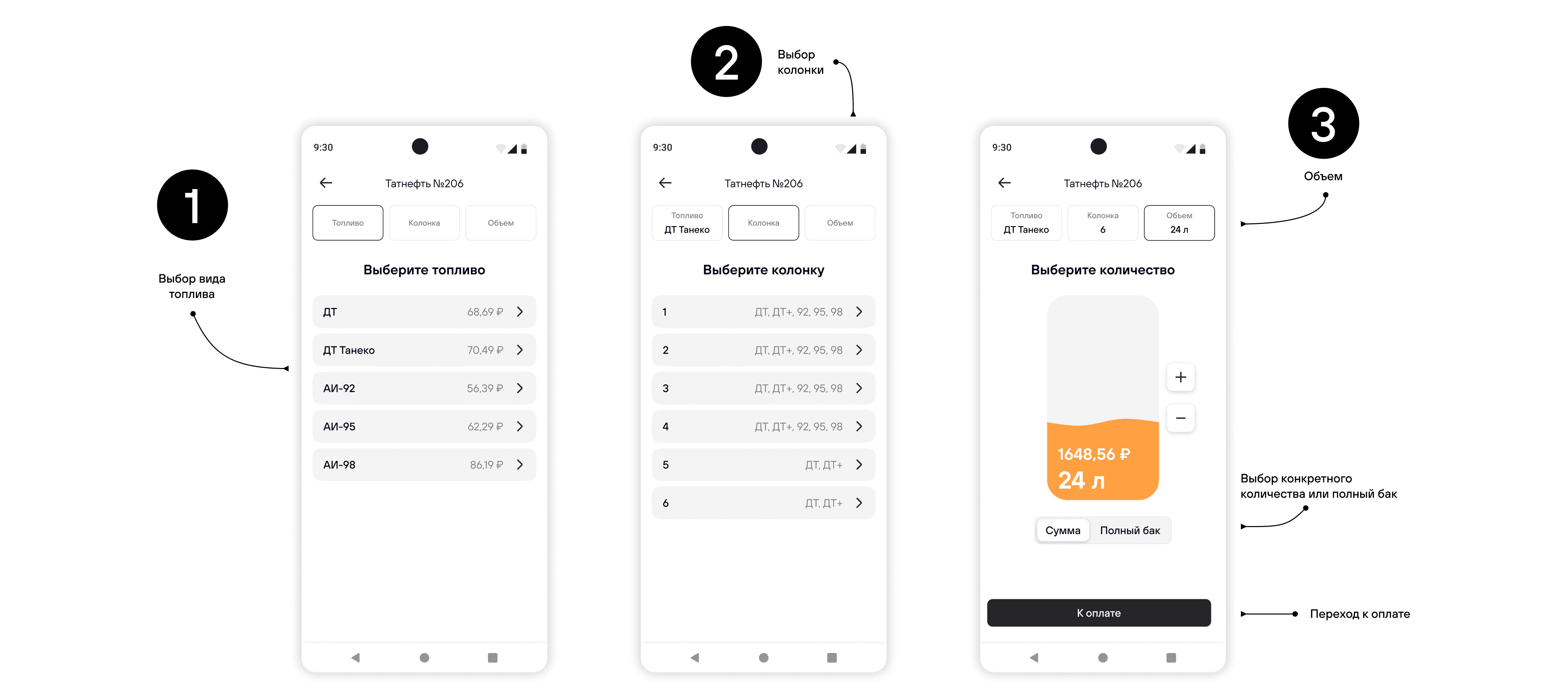 Если упростить последовательность действий, усилить визуальные акценты на выборе топлива и колонки, а также сократить количество переходов, то: