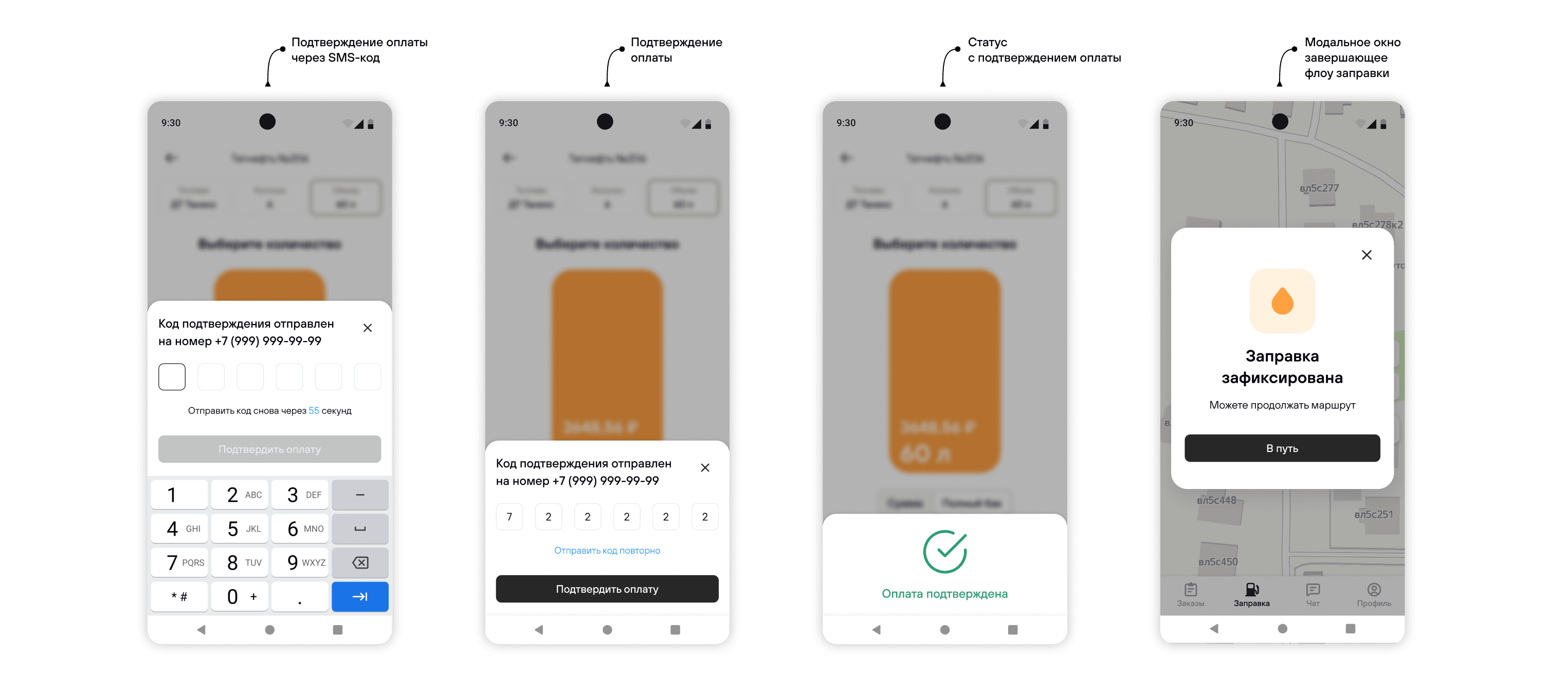 Экраны оплаты спроектированы как финальный и самый ответственный этап сценария, где важно обеспечить прозрачность и чувство контроля. На первом экране пользователь видит все параметры заправки и итоговую сумму, что позволяет зафиксировать выбор перед списанием средств.