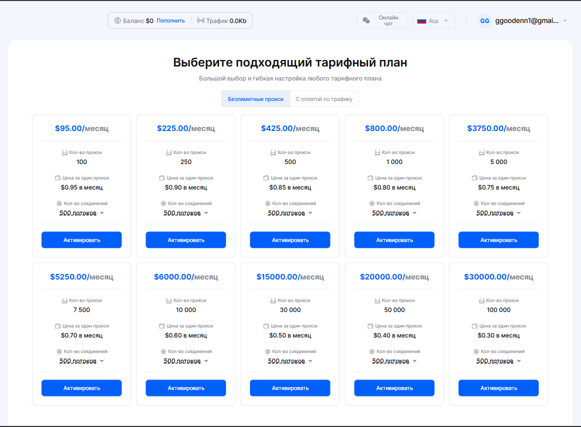 Прокси-сервис предлагал фиксированные пакеты IP по двум направлениям: безлимитные прокси и по трафику. Старый раздел тарифов представлял собой сетку из однотипных карточек.